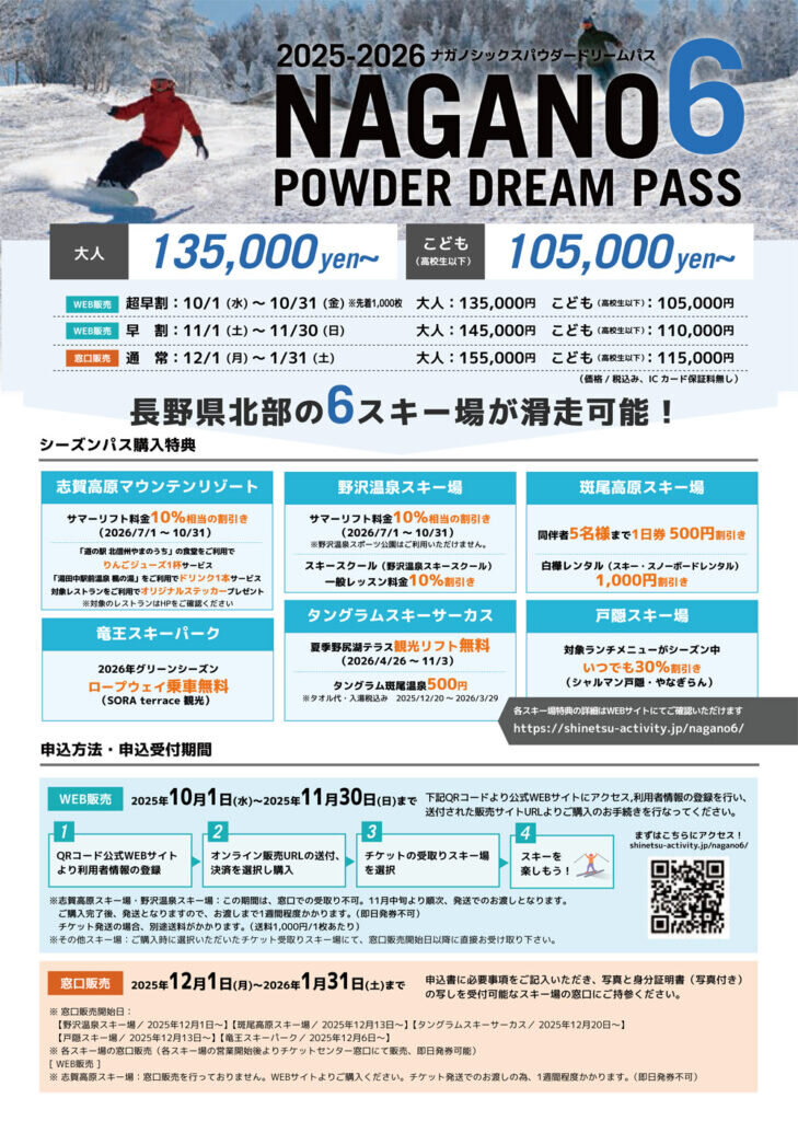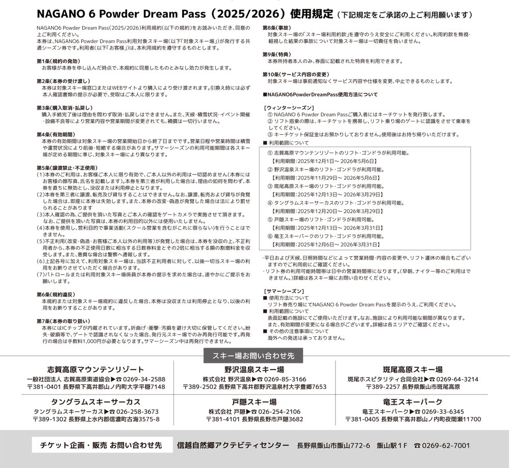 志賀高原マウンテンリゾート、野沢温泉スキー場、斑尾スキー場、タングラムスキーサーカス、戸隠スキー場、竜王スキーパークの6エリアでご利用いただける共通シーズンパスとなります。